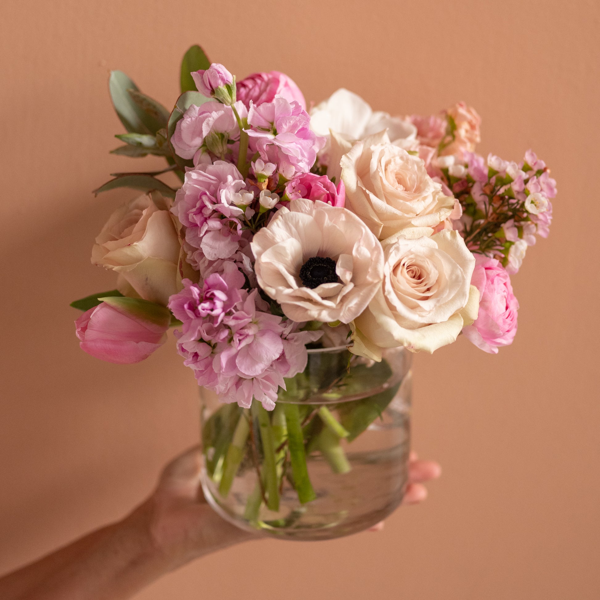 A mix of our favorite pastel pink and peach flowers arranged in a vase measuring 5x5” round.Overall height of the arrangement is approx 10”